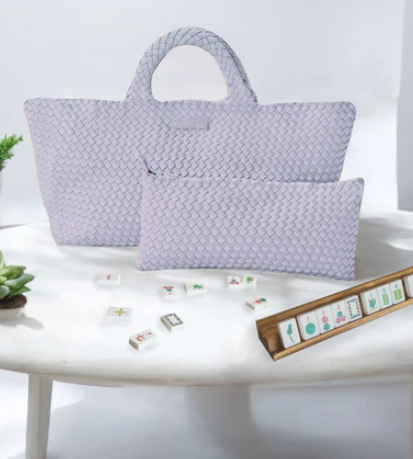 Looking for a bag that holds as much potential as your dreams? The large Woven Mahjong Carryall has it all. Featuring a convenient, removable matching pouch for your tiles, this dreamy bag is spacious enough to keep you organized, on trend and ready for the next game. Designed to carry all your mahjong necessities, it holds your tiles, racks, mat and cards. Made from durable woven neoprene this bag is easy to clean and comes with a detachable crossbody strap.