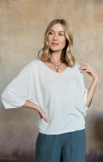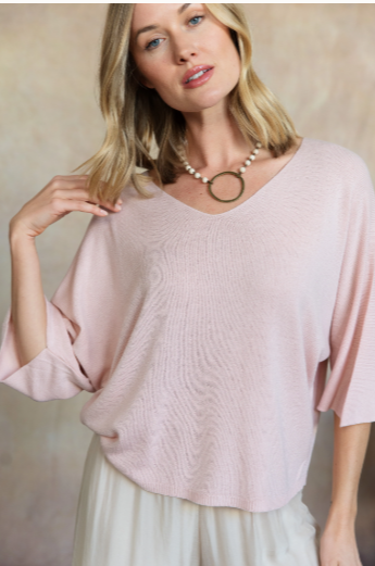 A versatile essential, the Esma Knit Top brings softness and sophistication to your spring wardrobe. Its drapey silhouette, dolman 3/4 sleeves, and soft v-neck create a relaxed yet polished look perfect for any occasion.