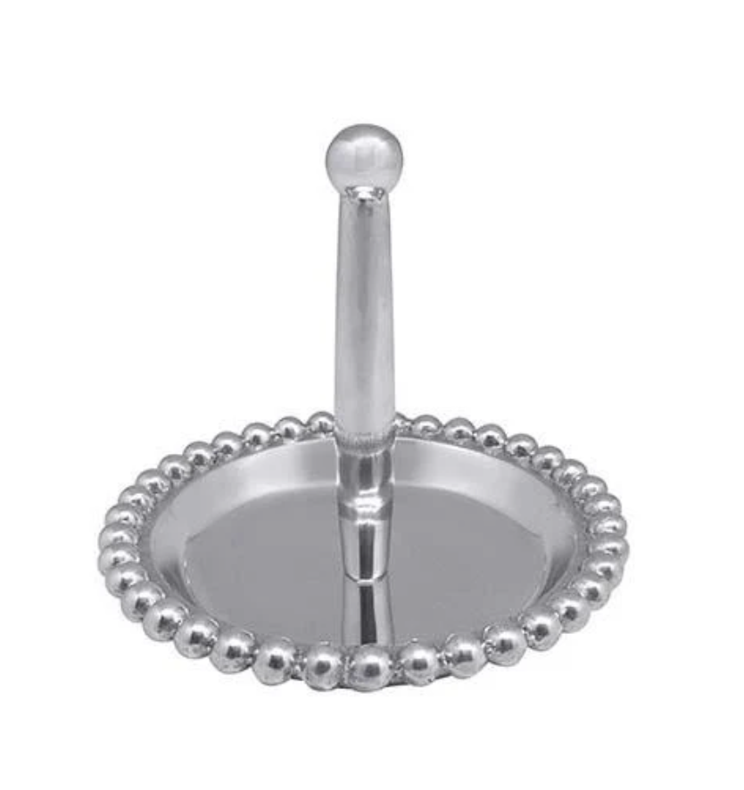 Keep your favorite rings safe but accessible with our beautiful and elegant Beaded Ring Dish. Simply slip the rings off your fingers and onto the cone at the center of the dish. You will never have to worry about losing a ring again. Handcrafted from 100% recycled aluminum.