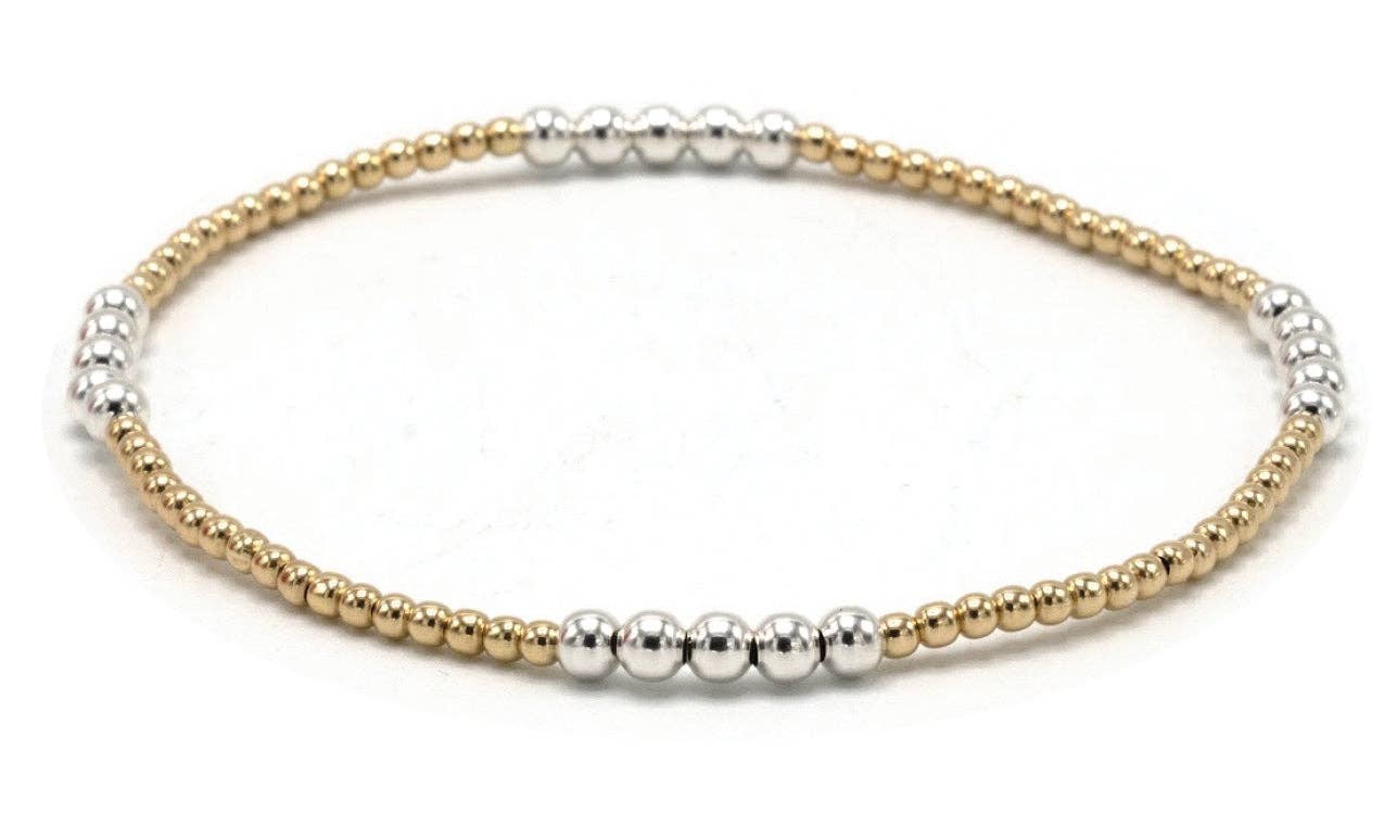 This collection offers a flawless blend of metals, featuring 2mm beads in 14k gold-filled or sterling silver alongside 3mm or 4mm beads in sterling silver or gold-filled, all set in our signature Hamptons design. Perfect for wearing alone or stacking to create a stylish, layered effect. Part of the erin gray waterproof collection, available in 6.5" and 7" stretch sizes for a comfortable fit. B-HAMP-SS