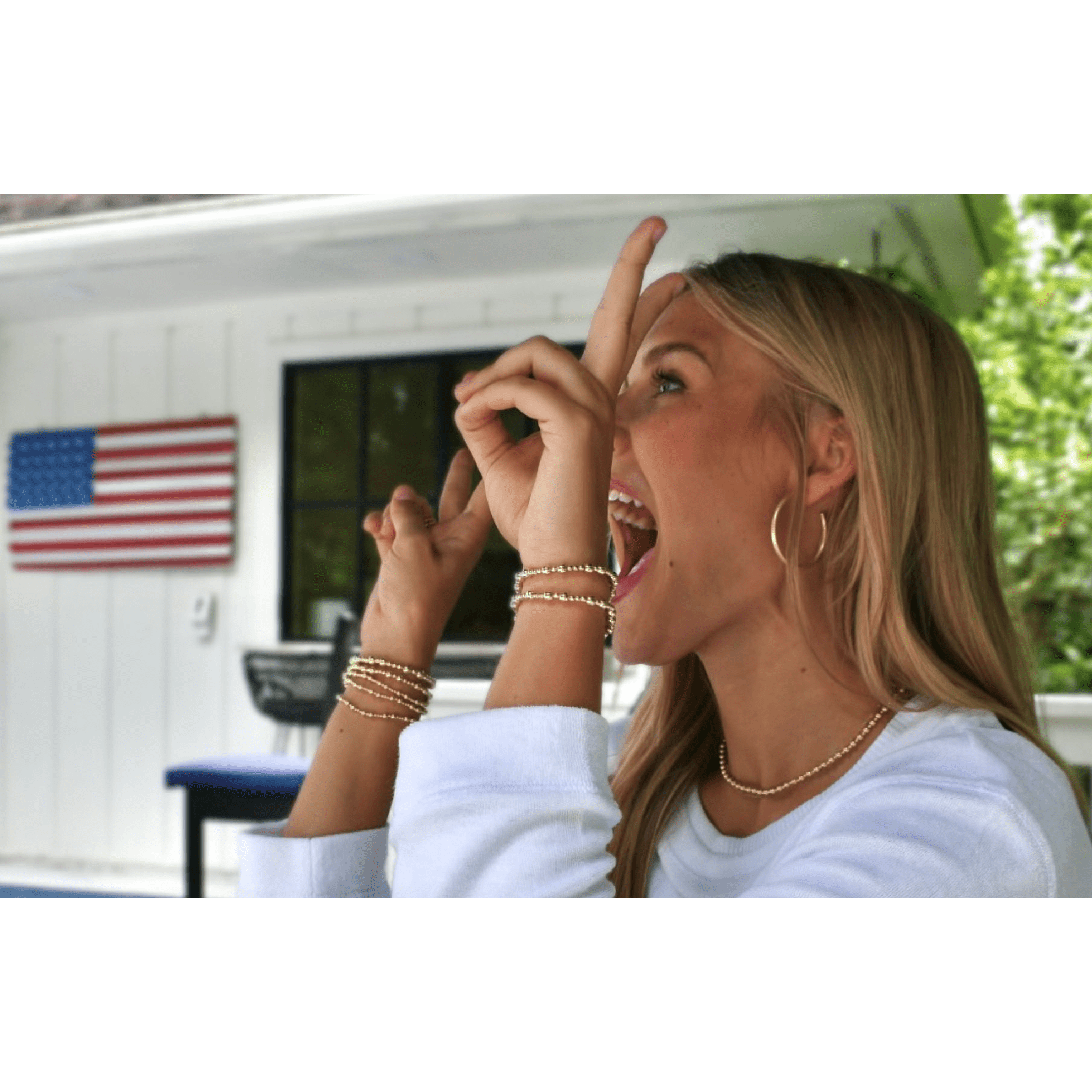 The Charleston bracelets, crafted with waterproof 14k gold-filled beads, are ideal for daily wear. They make thoughtful gifts for graduates, mothers, and friends. Available in two sizes and three elegant styles, they can be worn individually or stacked for a polished look. B-CHS