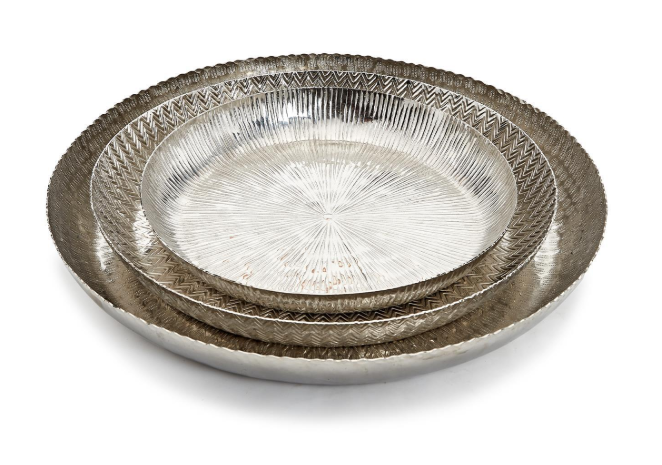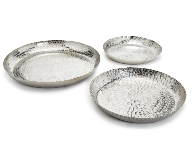 These classic and light round trays make a elegant and rich statement with their 3 dimensional pattern design. Crafted in aluminum, each has a elegant shiny silver patina that shows off just perfectly the hammered texture on the surface.