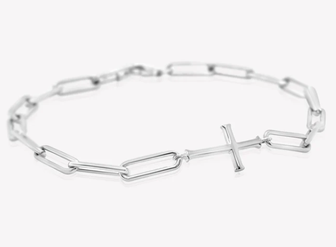 18 kt gold vermeil cross bracelet encased by a bold paperclip-style chain.