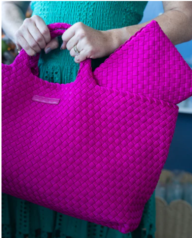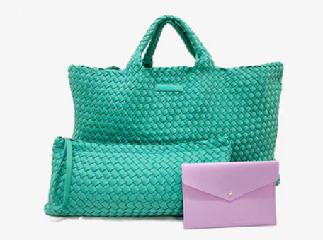 Looking for a bag that holds as much potential as your dreams? The large Woven Mahjong Carryall has it all. Featuring a convenient, removable matching pouch for your tiles, this dreamy bag is spacious enough to keep you organized, on trend and ready for the next game. Designed to carry all your mahjong necessities, it holds your tiles, racks, mat and cards. Made from durable woven neoprene this bag is easy to clean and comes with a detachable crossbody strap.