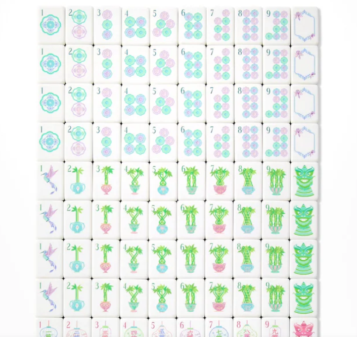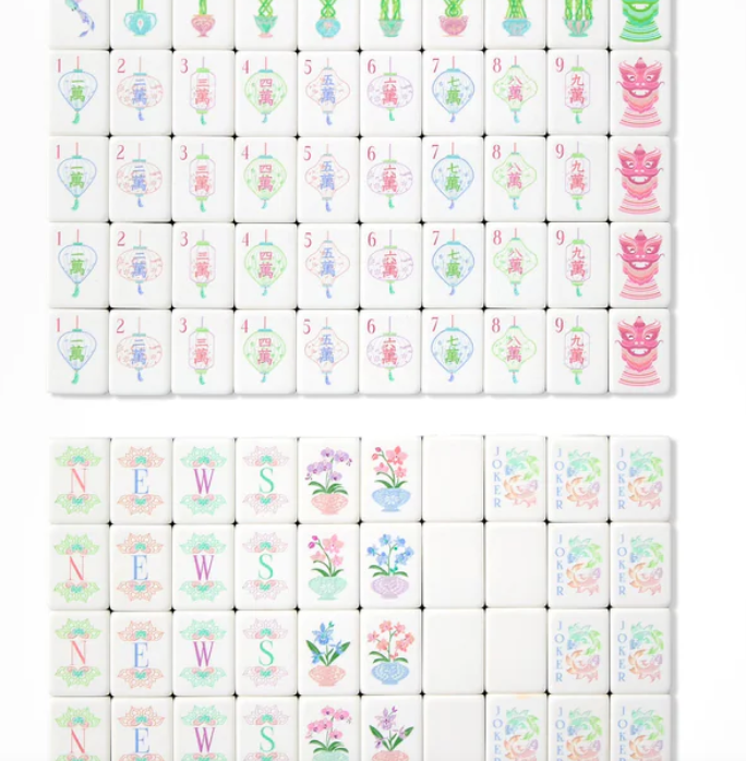 What's included: Tiles, a Dice/Coin Bag, and 4 Instructional Cards (you must purchase the NMJL Playing Card separately if you play American Mahjong).