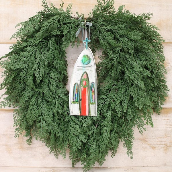 This 4x12" MDF wreath features a church design with a durable epoxy finish, crafted by Jamie Jones. Perfect for adding a meaningful touch to your décor.
