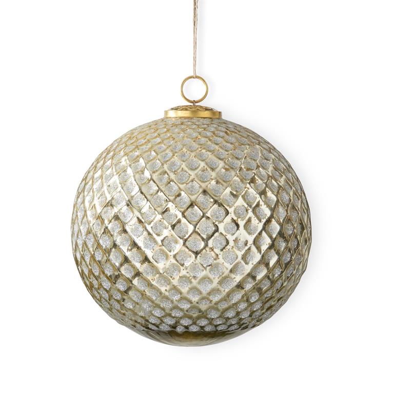 This 8-inch round ornament features a dazzling diamond pattern embossed on gold glitter glass, adding a sparkling touch to your holiday décor.