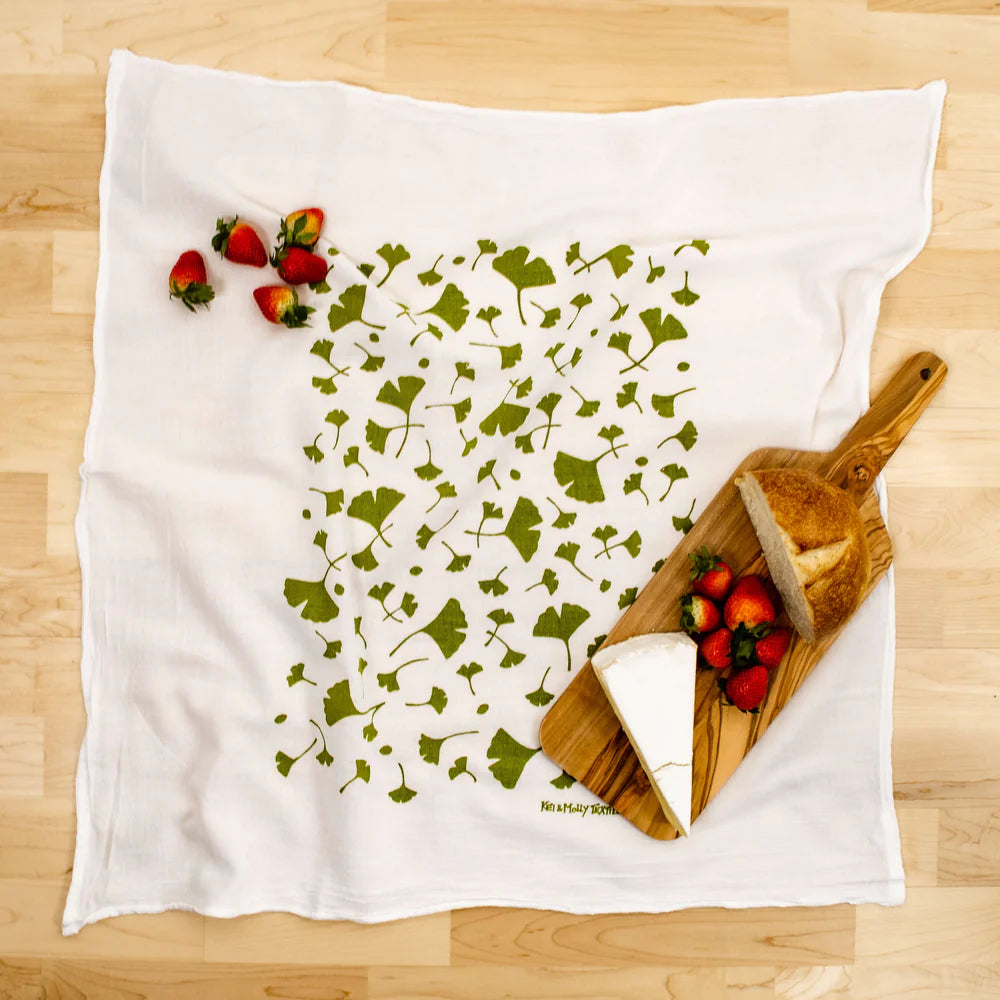 Another one of our Japanese inspired designs, this Ginkgo cotton dishtowel has been popular from the get-go. If you look carefully, you'll see that the ginkgo nuts are hiding between the leaves. If you've ever eaten Japanese chawanmushi, a kind of savory egg custard, you'll know what the nuts taste like. They are considered to have many health benefits:  they support cognitive function, help with skin rashes, and some believe that they are an aphrodisiac!  The Ginkgo tree itself is one the oldest species we know of, some fossils date back 270 million years! This is truly a venerable old plant that deserves to be honored!