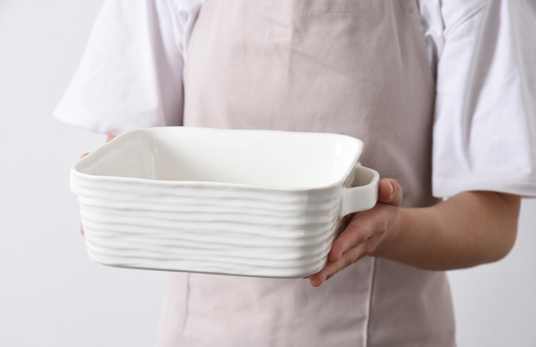 8″ x 8″ Square Baking Dish in Le Blanc. Impress with your culinary skill and presentation by serving up delicious entrees or pastries in this elegant dish. Versatile high-fired porcelain pieces that are microwave safe! Beautifully crafted with clean lines and organic shapes. Food safe, tarnish free, dishwasher safe, oven safe to 500°F. Easy Care. Capacity: 1.75 qt