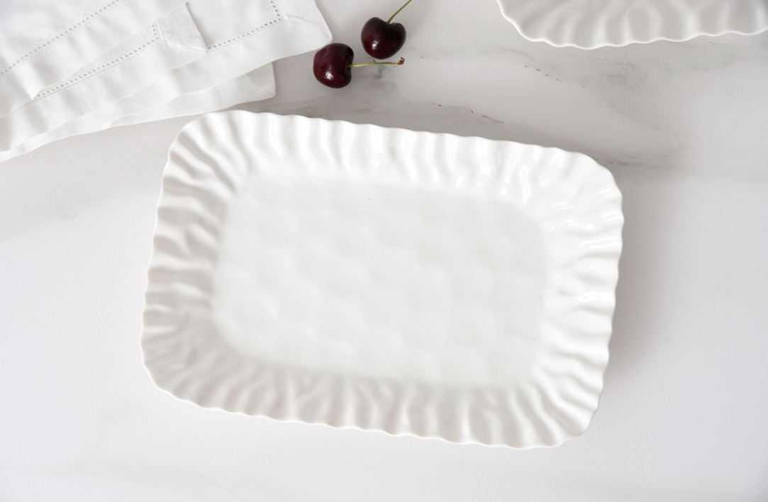 Medium Deep Tray in Mascali Bianca. Perfect for tempting guests with your delicious main course or hearty sides. Use for dessert to display an assortment of treats and sweets! Versatile high-fired porcelain pieces that are microwave safe! Food safe, dishwasher safe, oven safe to 500°F. Tarnish and stain-free. Easy Care