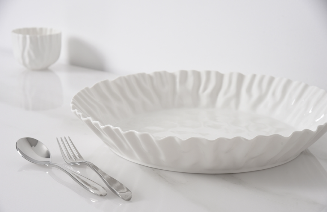 Round Deep Server in Mascali Bianca. A simple and elegant serving piece for crowd pleasing dishes like paella, chicken piccata and fettuccini alfredo. A perfect countertop piece to display fresh fruits or vegetables! Versatile high-fired porcelain pieces that are microwave safe! Food safe, dishwasher safe, oven safe to 500°F. Tarnish and stain-free. Easy Care.