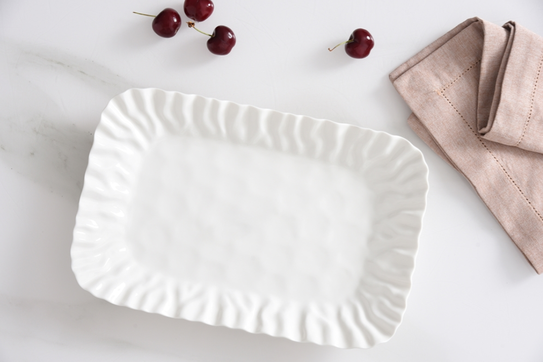 Small Deep Tray in Mascali Bianca. Perfect for tempting guests with your delicious main course or hearty sides. Use for dessert to display an assortment of treats and sweets! Versatile high-fired porcelain pieces that are microwave safe! Food safe, dishwasher safe, oven safe to 500°F. Tarnish and stain-free. Easy Care.