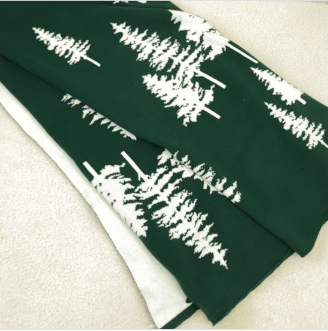 Cozy up with this 50x60 green and white throw featuring a charming pine tree design, perfect for adding warmth and style to any space.