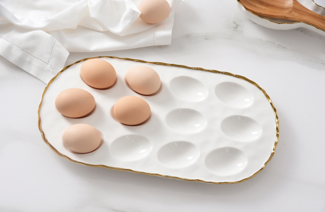 Oval Deviled Egg Tray in Portofino. The perfect accompaniment to relaxed weekend brunches, annual Easter celebrations or a fun night in, our egg tray is a great centerpiece for more than just eggs! Use to display a dozen deviled eggs at brunch or your beautifully decorated Easter eggs. This tray also makes for a great sushi display for a fun night in. Chill in the refrigerator first to keep food fresh and tasty when served. Gorgeous white porcelain with a delicate gold trim. Dishwasher safe, stain resistant, tarnish free, oven safe up to 500°F. Tarnish and stain-free. Easy Care.