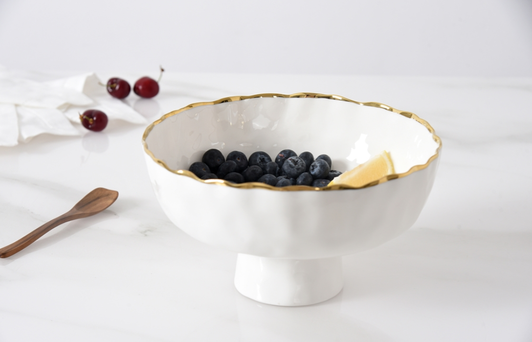 Meet the Footed Bowl in Portofino. A sweet, individual serving piece, this bowl is perfect for serving fruit, ice cream, candies, or nuts. Gorgeous white porcelain with a delicate gold trim. Food safe, dishwasher safe, oven safe. Easy Care.