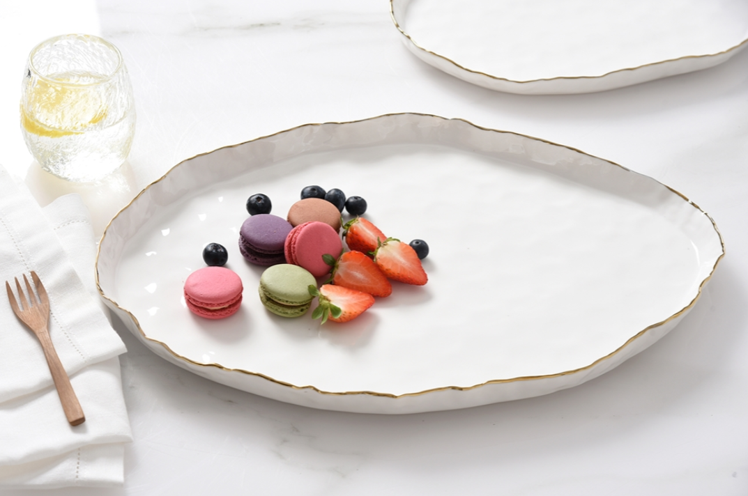 Perfect for tempting guests with your delicious main course or hearty sides. Use for dessert to display an assortment of treats and sweets! Gorgeous white porcelain with a delicate gold trim. Food safe, tarnish free, dishwasher safe, oven safe to 500°F. Easy Care.
