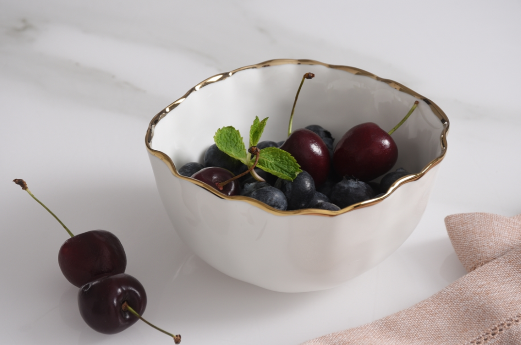 Snack Bowl in Portofino. Handle all your snacking with style! Great for small nibbles or on a buffet for condiments. Striking and elegant gold-tone finished high-fired porcelain. Food safe, tarnish free, dishwasher safe, oven safe to 500°. Easy Care.