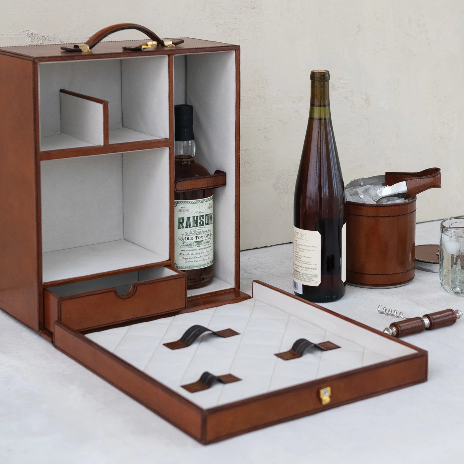 This elegant leather Travel Bar Trunk features a soft flocked interior and includes a 30 oz. stainless steel ice bucket, bottle opener, corkscrew, and tongs. With five organized compartments, a secure magnetic closure, a comfortable handle, and brass hardware, it combines style and functionality in cognac and cream tones. Complete with a set of five essential bar tools, it’s designed for refined on-the-go entertaining.